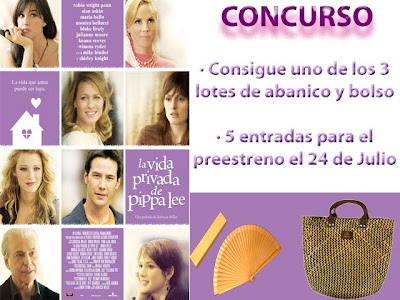 El próximo 25 de Junio se estrena en España la película La vida privada de Pippa Lee, protagonizada por un gran elenco de actores entre los que se encuentran Robin Wright Penn, Keanu Reeves, Julianne Moore, Winona Ryder, Maria Bello y Monica Bellucci.Por este motivo Trailers y Estrenos y TriPictures te invitan al preestreno de la cinta que tendrá lugar en Madrid el próximo 24 de Junio a las 22:00 horas en los cines DREAMS, sorteando 5 entradas dobles para tal evento. Además también se sortearán 3 lotes de merchandising compuesto por abanico y bolso.