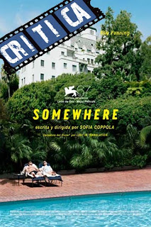 En Somewhere, por tanto, nos encontramos al personaje de Johnny Marco (Stephen Dorf), actor exitoso en el trabajo pero insatisfecho en lo personal, que pasa sus días entre fiestas y striptease privados en el legendario Chateau Marmont de Los Ángeles. La puesta en escena del día a día de una estrella del cine es asombrosa y precisa, bañada por esa melancólica y decadente luz californiana e impregnada de una gran dosis de ironía y surrealismo, la que sin duda rodea las vidas de los actores en muchas ocasiones. La directora consigue reflejar de forma certera un espacio que es lugar de paso pero también hogar para sus inquilinos y que será escenario de un encuentro de importancia vital para el protagonista.