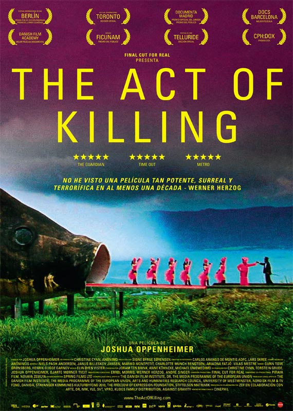 Sinopsis: Cuando el gobierno de Indonesia fue derrocado por el ejército en 1965, más de un millón de personas fueron asesinadas en menos de un año. Anwar y sus amigos fueron promocionados a jefes de escuadrones de la muerte y el mismo Anwar en persona asesinó a cientos de personas con sus propias manos. En ‘The act of killing’ Anwar y sus amigos acceden a contar sus historias sobre las matanzas. Pero la idea que tienen de aparecer en pantalla no tiene nada en común con el género documental; ellos quieren ser estrellas del celuloide de su género cinematográfico favorito: el cine de gansgsters, los westerns, los musicales. Ellos escriben los guiones. Ellos se interpretan a sí mismos. Y ellos mismos interpretan a sus víctimas. ‘The act of killing’ es una pesadilla, un viaje a los recuerdos y las fantasías de los autores impenitentes y del impactantemente banal régimen de corrupción e impunidad en el que habitan.